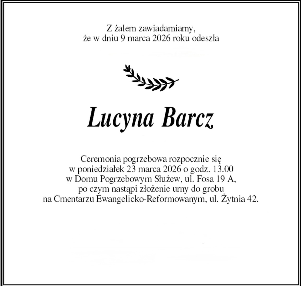 9 marca w wieku 94 lat zmarła członkini naszego Oddziału red. Lucyna Barcz. Gdy miała 20 lat zaczęła pracę jako redaktorka działu wiejskiego „Sztandaru Młodych”. W środowisku dziennikarskim szybko dała się poznać dzięki wyjątkowemu zaangażowaniu oraz niezwykłej empatii wobec współpracowników i czytelników. Dzięki temu, już po kilku latach otrzymała ofertę pracy od Telewizji Polskiej. Została jedną z pierwszych redaktorek „Telewizyjnego Kuriera Warszawskiego” oraz współtwórczynią Redakcji Łączności z Widzami, który współtworzyła u boku Stanisława Cześnina.
